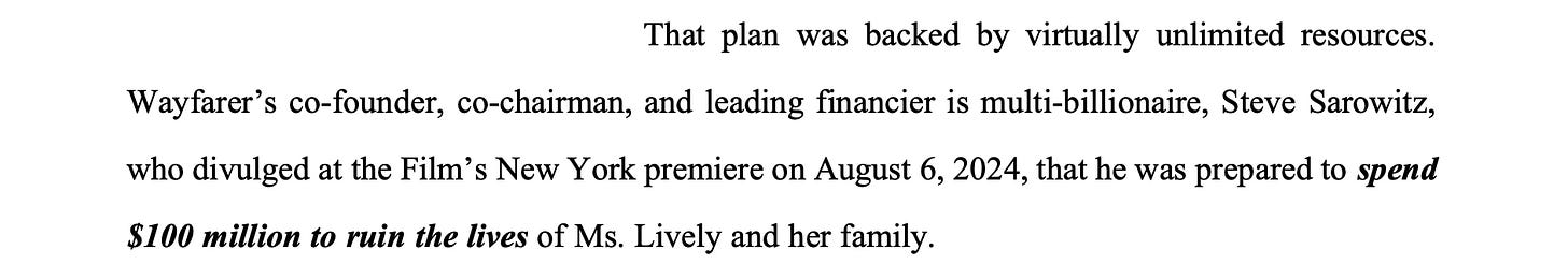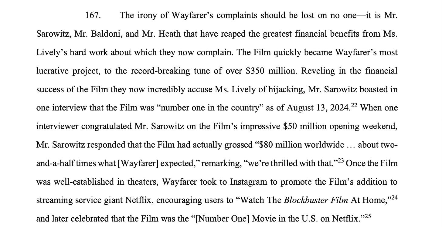 “Mr. Sarowitz, Mr. Baldoni, and Mr. Heath that have reaped the greatest financial benefits from Ms. Lively’s hard work.”