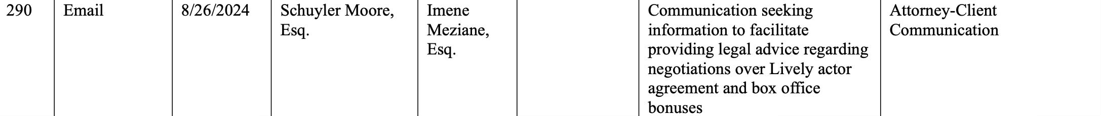 Five days later, on August 26, you have Schuyler Moore, Esq. emailing Wayfarer’s contract lawyer Imene Meziane, Esq., “seeking information to facilitate providing legal advice regarding negotiations over Lively actor agreement and box office bonuses.”