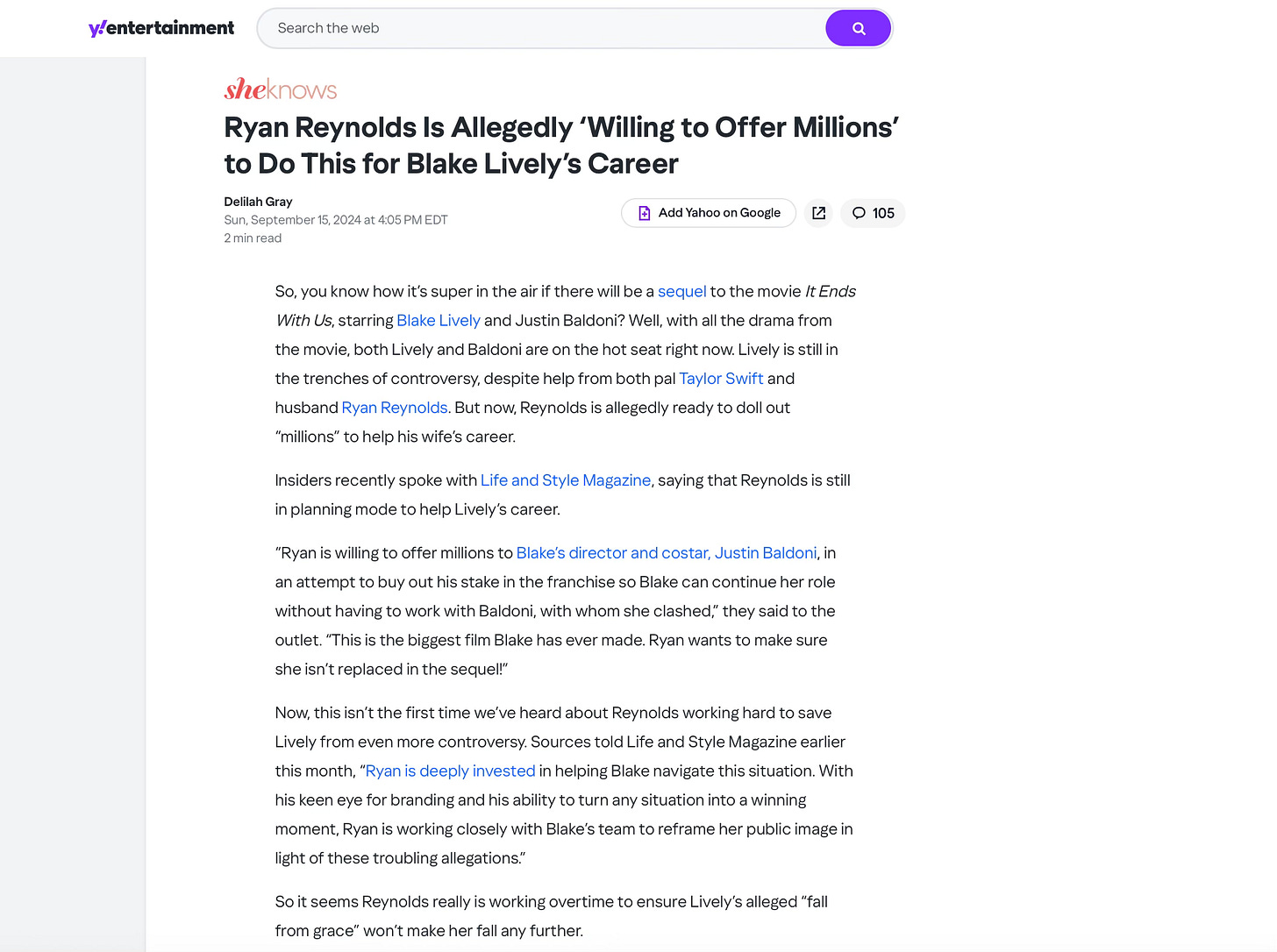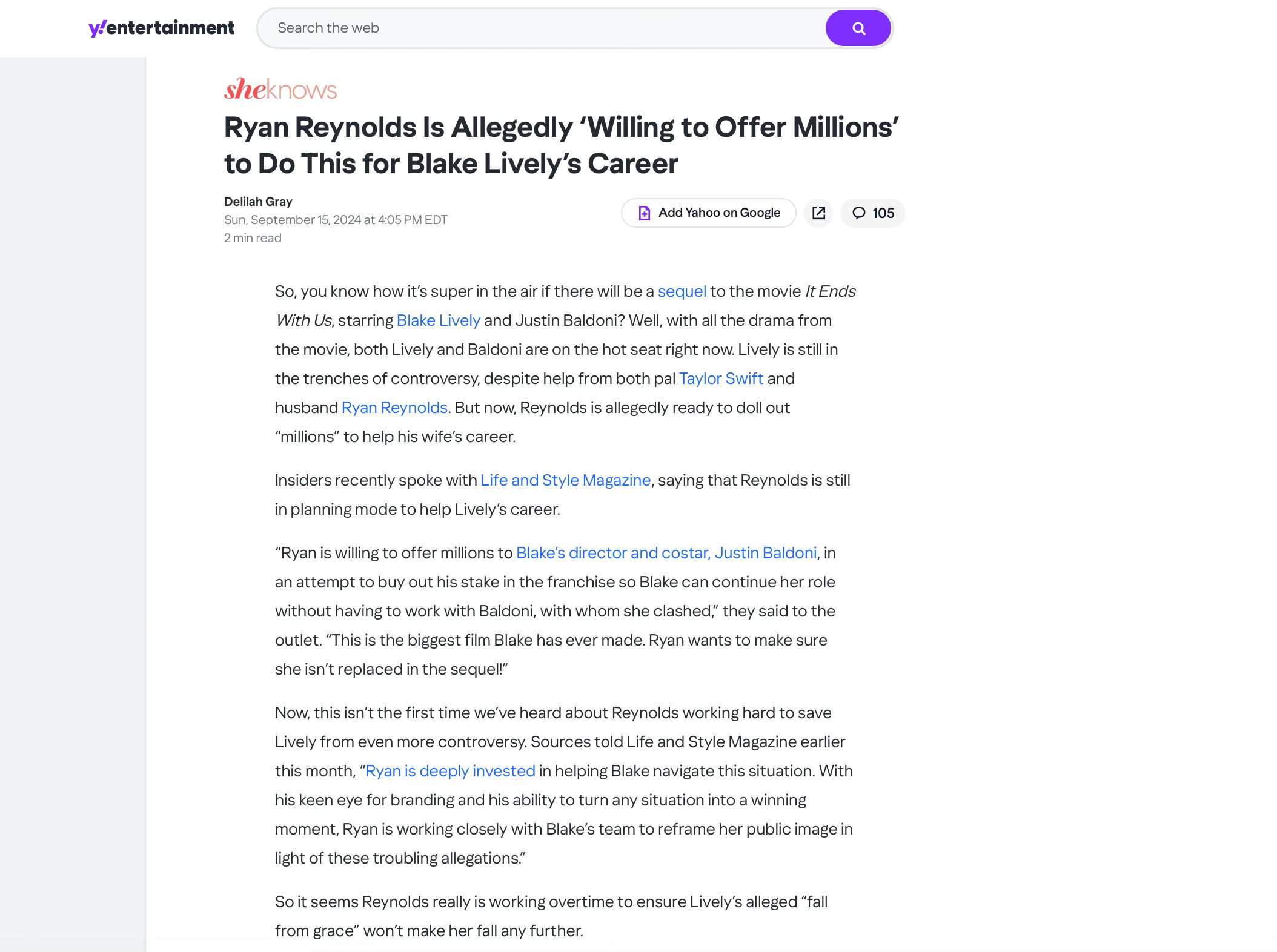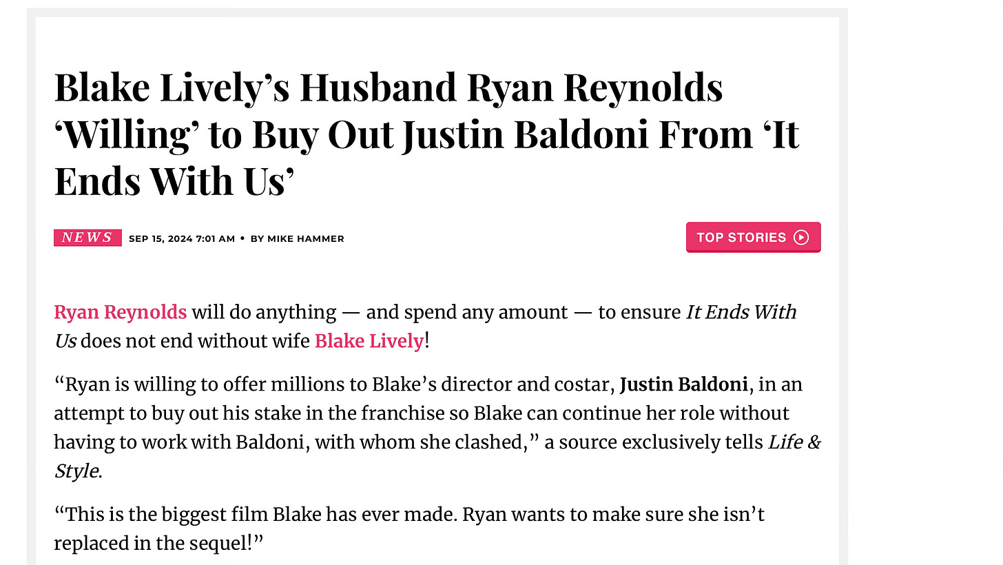 I don't think that week went well for Blake Lively. Well, because September 15, 2024 was when we were breadcrumbed in Life and Style Mag and Y! Entertainment that Ryan Reynolds had attempted to buy the IEWU sequel rights.
