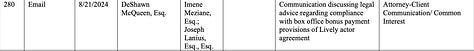 A money guy at Sony reaches out to Wayfarer’s contract lawyer to ask about how they’re going to address Blake’s box office bonus payment, in compliance with her ALA. So then they loop in one of the lawyers that handle deal negotiation, compliance and who can act as a liaison.