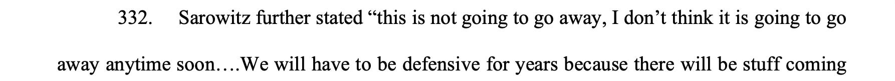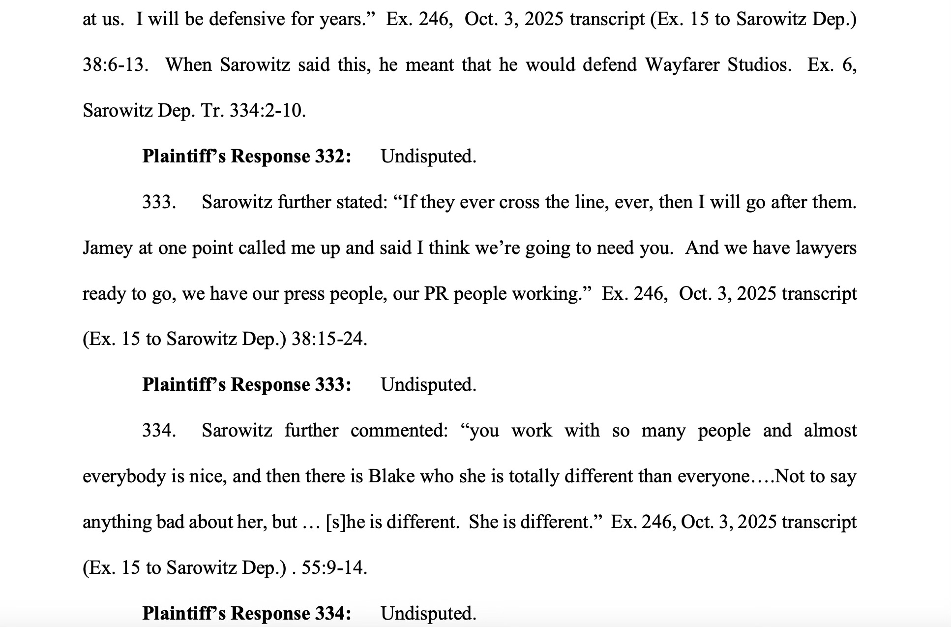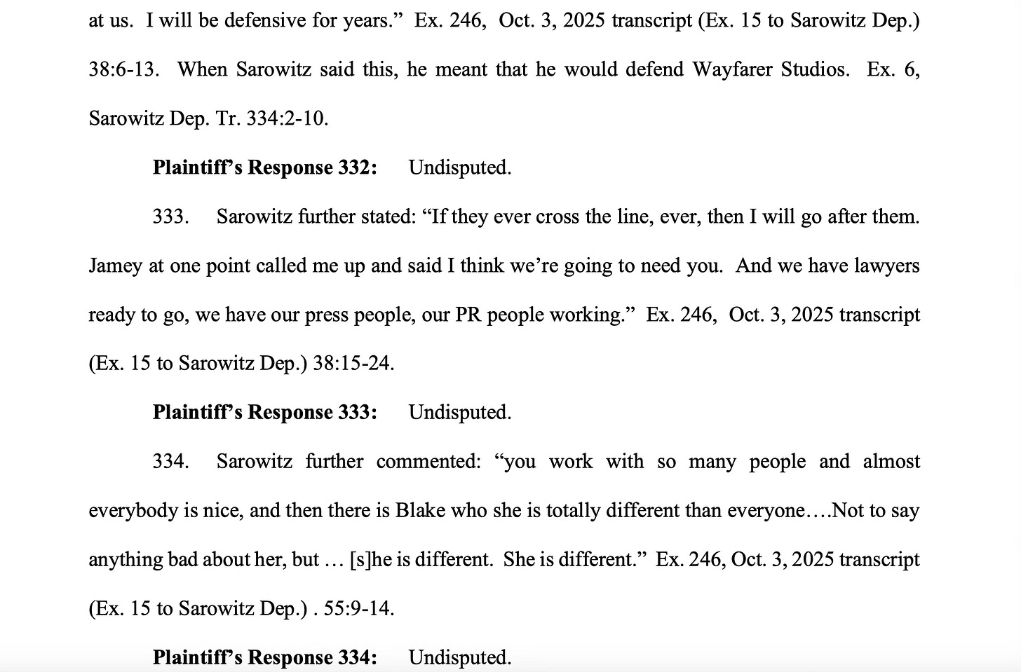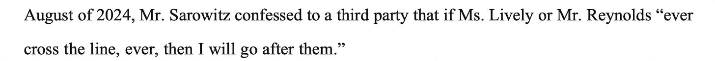 And upon information and belief, Steve, or the person who was recounting to Blake, was probably talking about Steve’s investment in Wayfarer, which he needs to protect. And Blake somehow mistook that to mean Sarowitz was gearing up to fight her. Then she went ahead and misrepresented what happened because, well, she can. And well, she has done exactly that a million times over.”