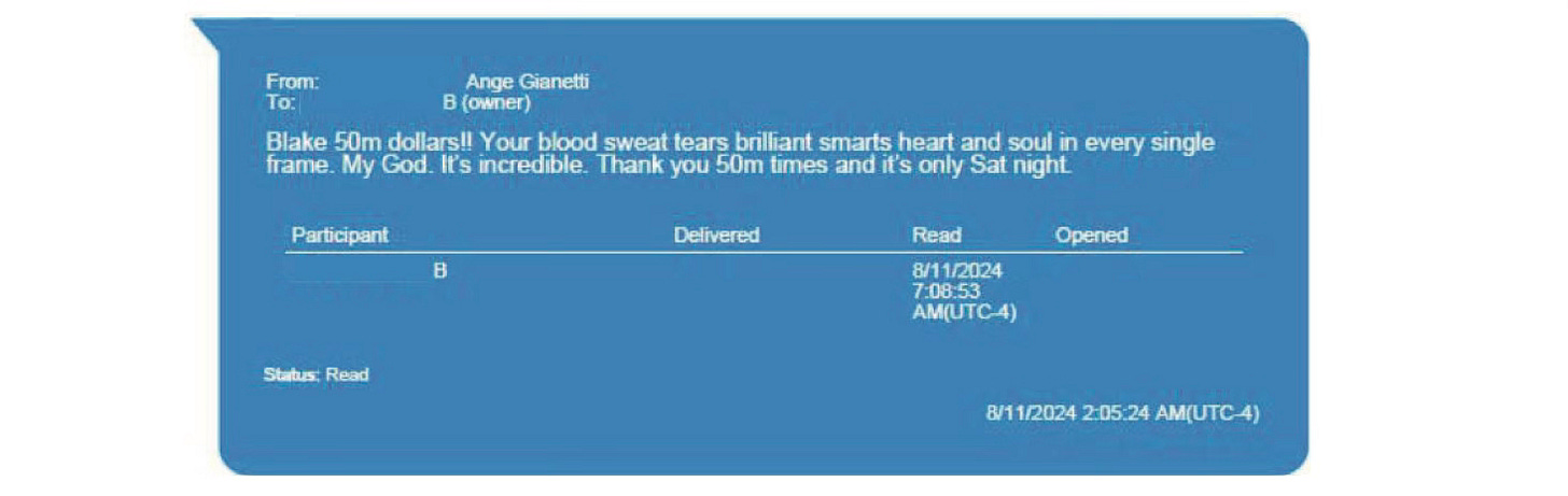 Or, did Jen Abel advise them to gear up for possible litigation because they just told Blake Lively a few days ago she ain’t getting the $36+ million she had been counting on since August 11, 2024, when Sony’s Angie Gianetti allegedly texted her “Blake 50m dollars!” about the box office opening number?